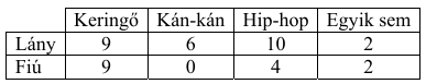 Egy 32 fős érettségiző osztály tanulói három különböző táncot mutatnak be a szalagavató bálon. Az alábbi táblázat az egyes táncokban fellépő diákok számát mutatja nemenkénti bontásban.